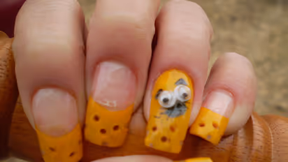 This particular and bizarre yet realistic-looking nail art has been a hit on Instagram. All you need are acrylic nails that have holes drilled in them, and coats of yellow and white nail paint.