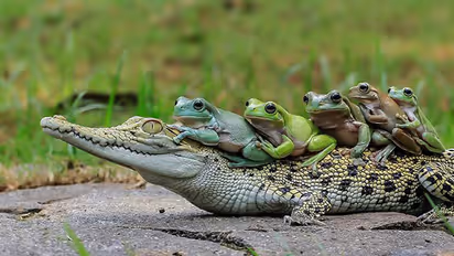 The crocodile is a much-feared reptile for most humans and animals. But, clearly, one species failed to get the memo - the amphibians!