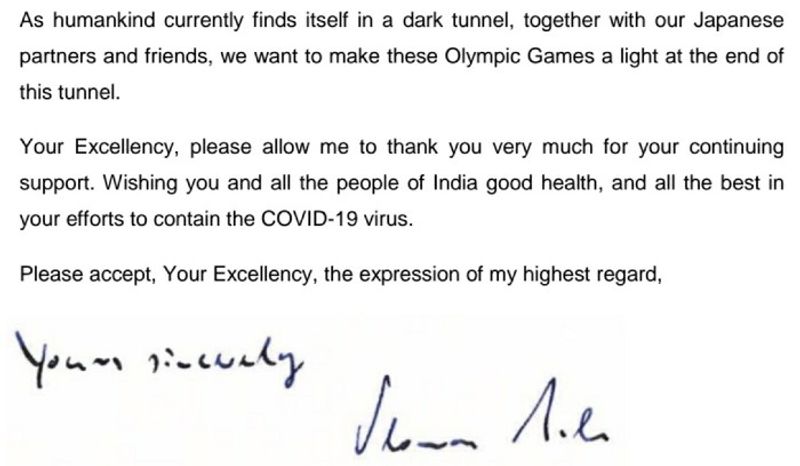 The letter from Back to PM Modi was shared on Twitter by Union sports minister Kiren Rijiju. He wrote on Thursday (April 2), “Letter of appreciation from the President of International Olympic Committee to Hon'ble Prime Minister Shri @narendramodi ji for his commitment and contribution in containing COVID-19 and for promoting the cause of Olympics to make it a symbol of human resilience (sic).”