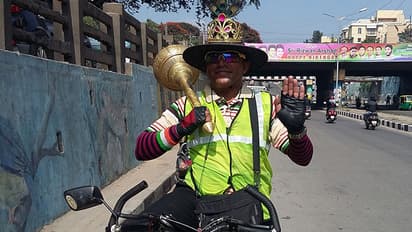 Satish, who is now more fondly addressed to as cycle baba or hanuman is 40 years and has been cycling all to way to IISC campus from Indiranagar for the last 6 years. What is interesting is that he dresses up as Lord Krishna and holds Hanuman 'Gahda' (mace) and peddles all the way meeting and greeting people, asking them not to hate. He also doesn't hold the cycle handles unless if it is really required.