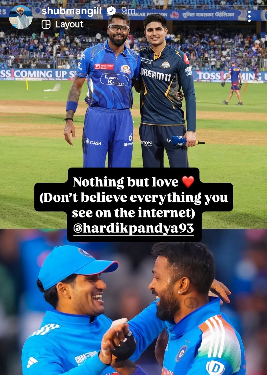Taking to his Instagram story, Shubman Gill posted a two-picture collage featuring him and Hardik Pandya and urged everyone not to blindly believe everything on social media.