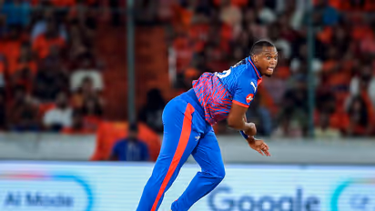 In the third over of Punjab Kings' innings, bowled by Axar Patel, Lungi Ngidi went for a catch off a lofted shot from Priyansh Arya. He tracked the ball while back-pedalling but never seemed in control of the attempt, stretching backwards without getting a fingertip to it. In the process, he landed heavily on his head, making for a worrying moment on the field.