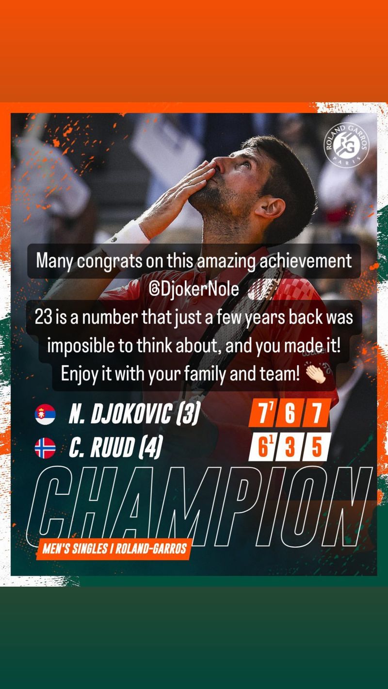 "Many congrats on this amazing achievement @DjokerNole. 23 is a number that just a few years back was imposible to think about, and you made it! Enjoy it with your family and team!" wrote Nadal on Twitter.