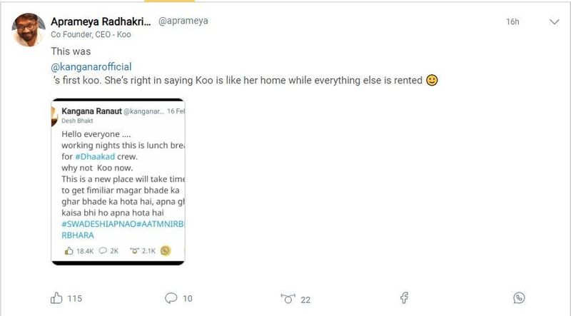 The founder of the Koo app, Aprameya Radhakrishna, stated that Koo's platform is like home for Kangana Ranaut. When the actress first joined Koo, she made her first post in the month of February.