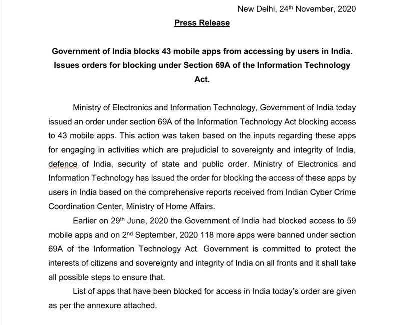 "This action was taken based on the inputs regarding these apps for engaging in activities which are prejudicial to sovereignty and integrity of India, defence of India, the security of the state and public order," read the official statement.
