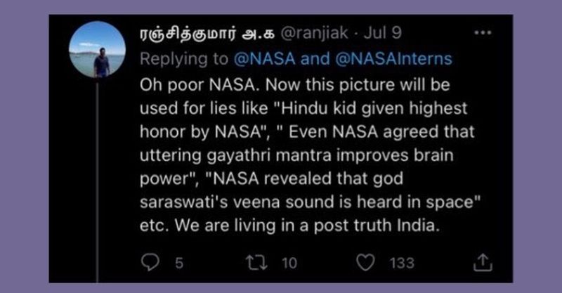 "It is not surprising that those who believe in flat earth theory are jealous over Hindu devotee women achieving in science and technology. Carry on. Your bigotry will make my faith stronger," the NASA data analyst intern added.