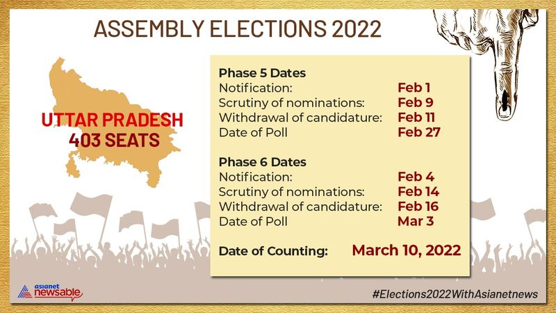 The Election Commission of India on Saturday announced the schedule and the dates for the Uttar Pradesh Legislative Assembly that would be held in 7 phases for 403 seats. Uttar Pradesh Election 2022 will be held in 7 phases from February 10, 2022 to March 7, 2022 and the votes polled in the state Assembly polls will be counted on March 10, 2022.