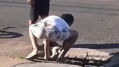 In the video, a boy can be seen rescuing a cat that fell into a drain.
