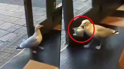 A hilarious video shows a seagull walks into a store and move towards the snacks rack. The bird takes a bag of chips with its beak and walks out of the shop in no time. Another seagull who was waiting outside the store move together and enjoy the chips.
