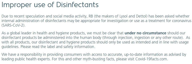 “As a global leader in health and hygiene products, we must be clear that under no circumstance should our disinfectant products be administered into the human body (through injection, ingestion or any other route). As with all products, our disinfectant and hygiene products should only be used as intended and in line with usage guidelines. Please read the label and safety information.