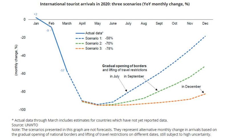 Scenario 1 (-58%) based on the gradual opening of international borders and easing of travel restrictions in early July