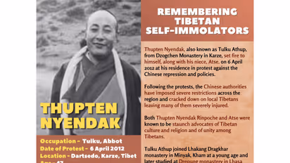 The Central Tibetan Administration (CTA) commemorated Tibetan monk Thupten Nyendak on the anniversary of his self-immolation protest, renewing concerns over religious freedom and cultural preservation in Tibet. In a post shared on the social media platform X, the CTA's Tibet Advocacy Section remembered Thupten Nyendak, also known as Tulku Athup, as a revered spiritual leader, a Tulku and an abbot, who sacrificed his life at the age of 47 on April 6, 2012, in Dartsedo, Karze, Tibet.