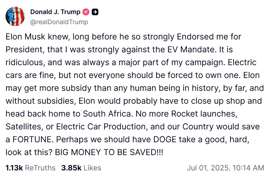 Trump’s post appeared to hit back at Musk’s recent online comments against the US President's top legislative plan.