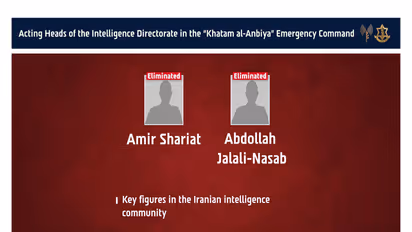 The IDF identified the officials as Abdollah Jalali-Nasab and Amir Shariat, describing them as senior intelligence figures in Iran's Khatam al-Anbiya emergency command.