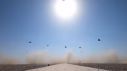 The visuals, shared in a post on X and on Telegram by state broadcasters, show several delta-wing drones positioned along a paved runway under a bright sun. Upon ignition, the drones launch simultaneously, emitting bright orange flashes from their boosters and kicking up dense clouds of dust and sand. As the sequence progresses, the camera captures the drones ascending rapidly into the sky, leaving behind thick white smoke trails. The footage transitions to show the aircraft flying in a tight formation across the horizon, moving away from the launch site as part of the reported "swarm" deployment.
