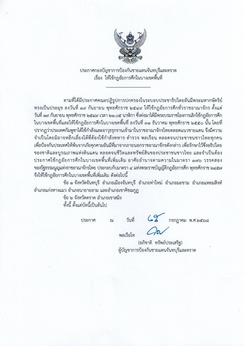 The Internal Security Operations Command (ISOC) issued a public order amid Thailand-Cambodia conflict. The notice was signed by Admiral Aditad Thiraprasert, who leads the ISOC for Chanthaburi and Trat provinces. It announced that a special emergency zone is now in effect in some areas along the Thai-Cambodian border.