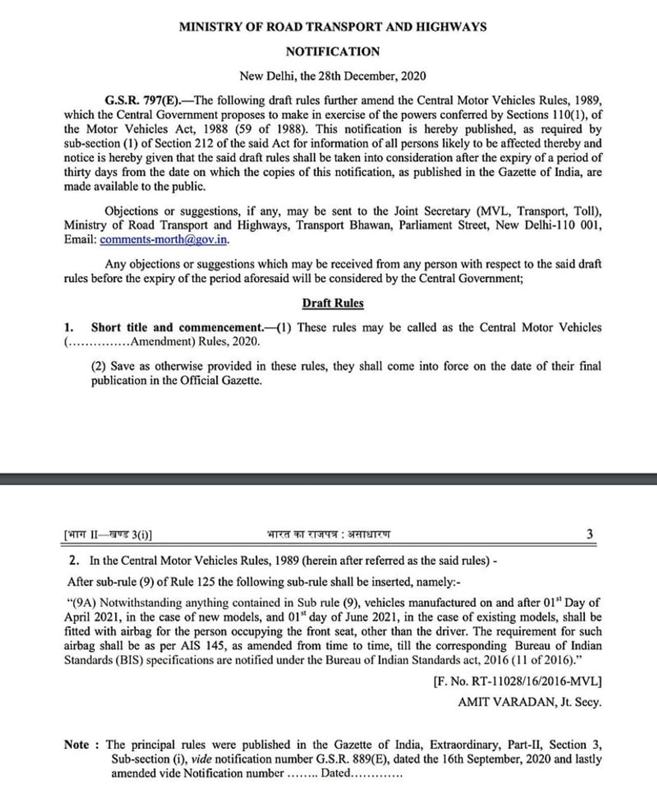 The draft rule, notified on December 28, states: "Notwithstanding anything contained in sub-rule (9) vehicles manufactured on or after 01st day of April 2021, in case of new models and the first day of June 2021, in case of existing models, shall be fitted with airbag for the person occupying the front seat other than the driver. The requirement for such airbag shall be as per AIS 145, as amended from time to time, till the corresponding Bureau of Indian Standards (BIS) specifications are notified under the BIS Act, 2016."