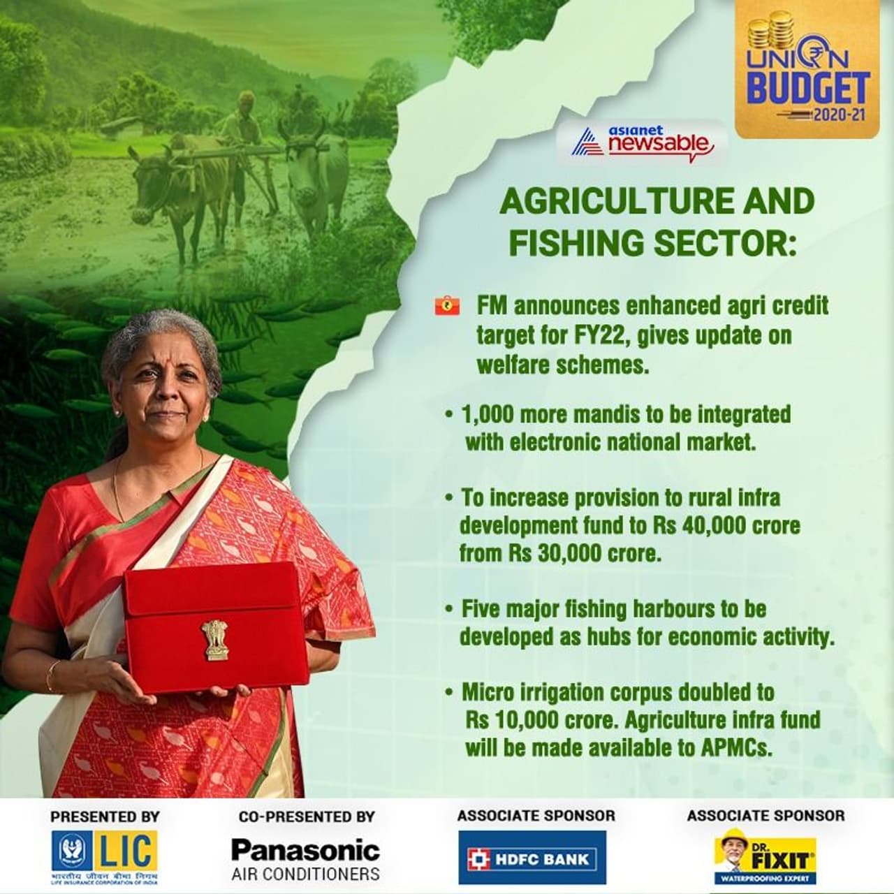 · Micro irrigation corpus doubled to Rs 10,000 crore. Agriculture infra fund will be made available to APMCs.