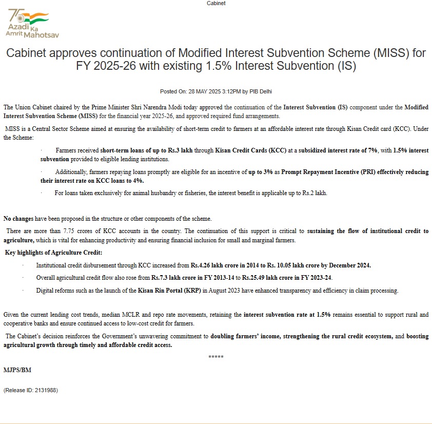 The Union Cabinet has extended the Modified Interest Subvention Scheme for FY 2025-26, retaining a 1.5% subsidy on farm loans via Kisan Credit Cards, supporting rural credit access and aiding farmers with affordable borrowing.