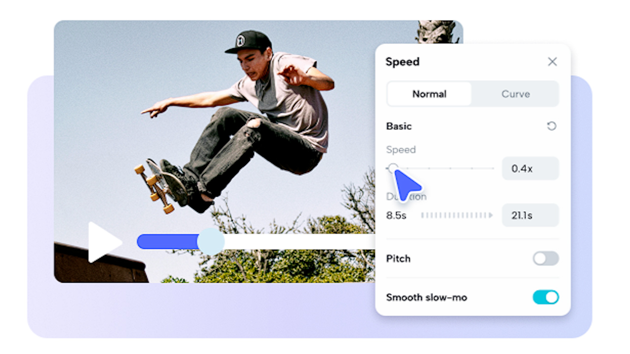 Select your clip on the timeline and press "Speed" in the right panel. Adjust the slider in the "Normal" tab to stretch or condense time, or pick the "Curve" tab for dramatic motion shifts. Enable "Smooth slow-mo" or "Pitch" for extra cinematic flair.