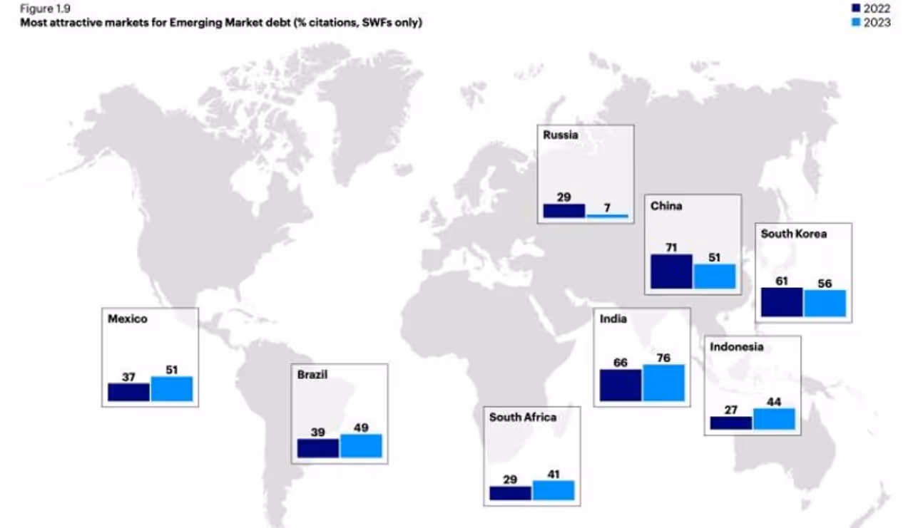 The study highlights India as an exemplification of the qualities sought by sovereign investors. It notes that India is increasingly viewed positively for its improved business and political stability, favourable demographics, regulatory initiatives, and welcoming environment for sovereign investors. In fact, India has surpassed China as the most attractive emerging market for investing in emerging market debt.