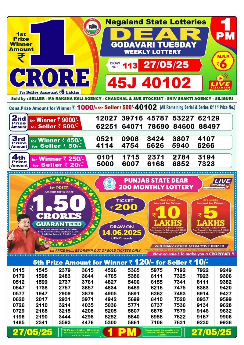 Nagaland is among the 13 Indian states where lottery operations are legally permitted. Others include West Bengal, Madhya Pradesh, Punjab, Mizoram, Kerala, Maharashtra, Goa, Manipur, Sikkim, Arunachal Pradesh, Meghalaya, and Assam. Each of today’s draws offers a top prize of Rs 1 crore, making it a life-changing opportunity for many.