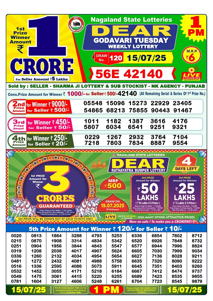 Lottery enthusiasts across the country are eagerly awaiting the results of the Nagaland State Lottery draws scheduled for Tuesday, July 15. As per routine, the winning numbers will be declared in three phases—Dear Morning at 1 PM, Dear Evening at 6 PM, and Dear Night at 8 PM.