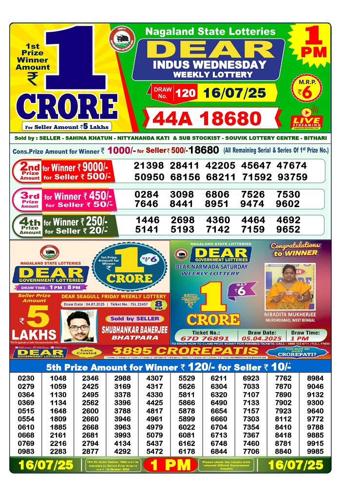 Lottery enthusiasts across India are eagerly waiting for today's (July 16) Nagaland State Lottery results, which will be announced as per the regular schedule. The draw timings are set for 1 PM, 6 PM, and 8 PM respectively.