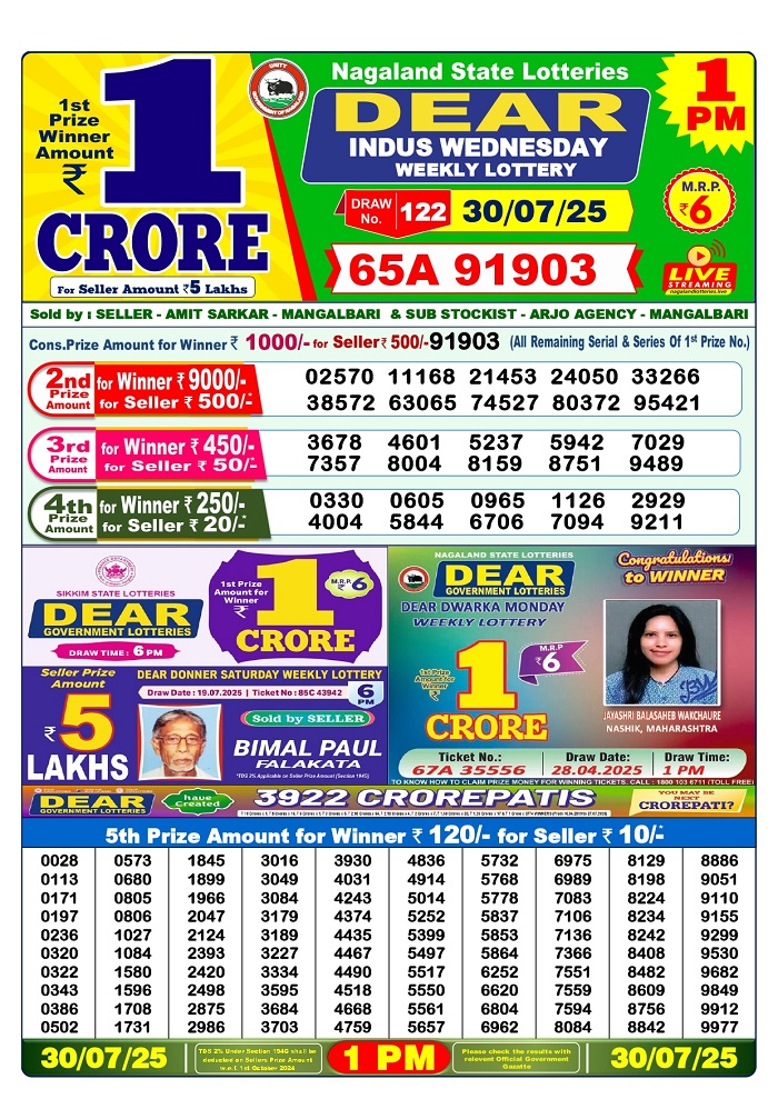 Nagaland State Lottery results for July 30, 2025, include "Dear Indus Morning" (1 PM), "Dear Cupid Evening" (6 PM), and "Dear Pelican Night" (8 PM) draws. Prizes range from Rs 120 to Rs 1 crore.