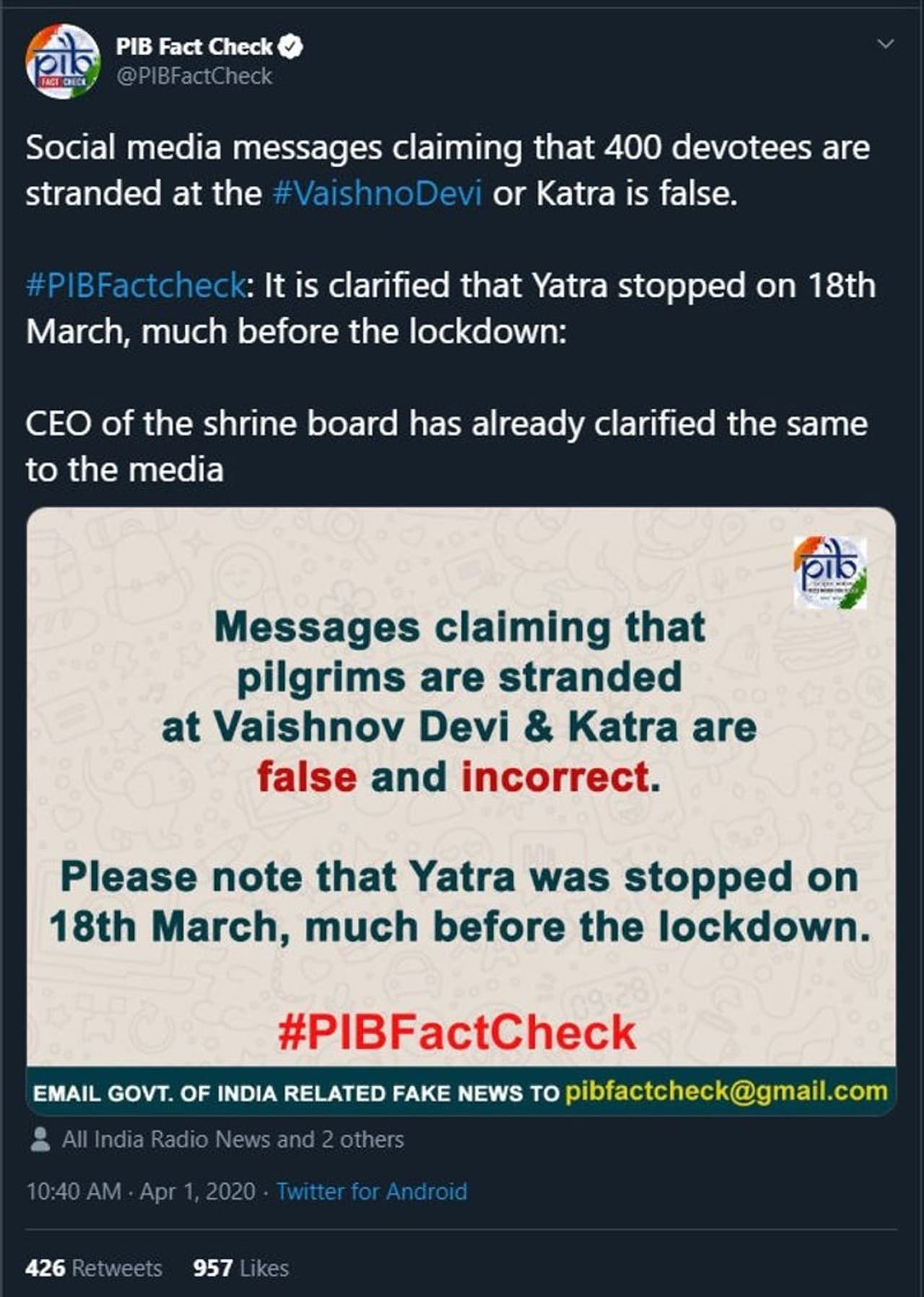 PIB Fact Check's Twitter handle also negated all the rumours indicating that 400 devotees are stranded at Vaishno Devi in Katra. PIB Fact Check clarifies any misinformation on government policies and schemes.