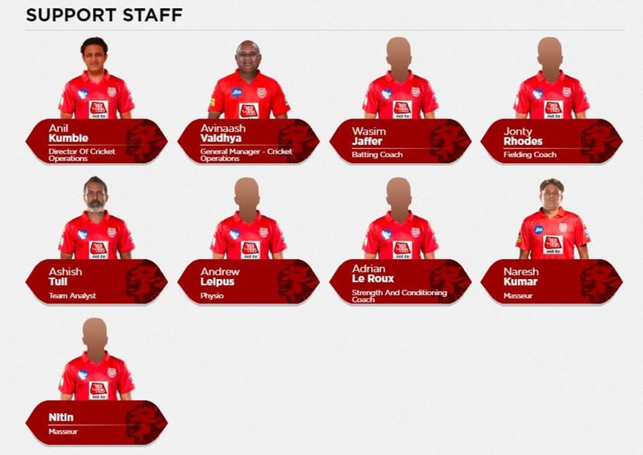 Ahead of the season, KXIP had appointed former India captain Anil Kumble as their head coach. Andre Leipus is the physio while Adrian le Roux is the strength and conditioning coach.