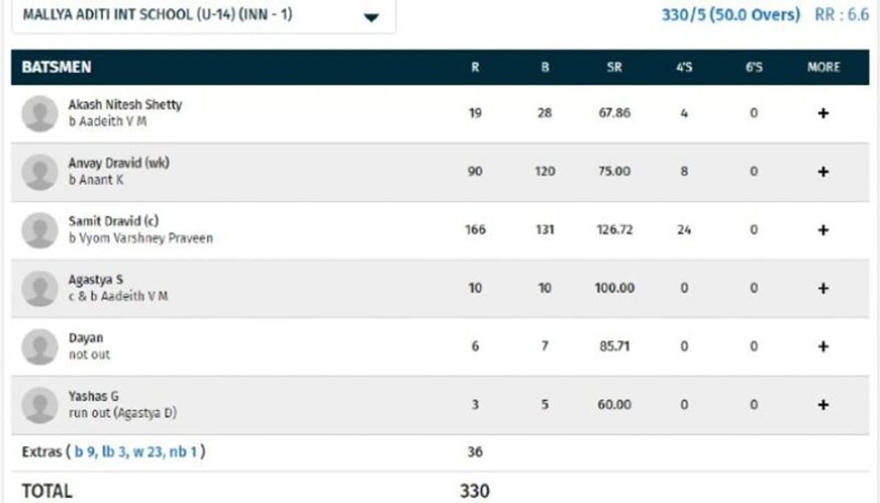 Earlier in the tournament, Samit had hit a double century (211 not out) against BGS National Public School. Prior to this, in the KSCA Under-14 inter-zonal tournament, Samit had hit 201.