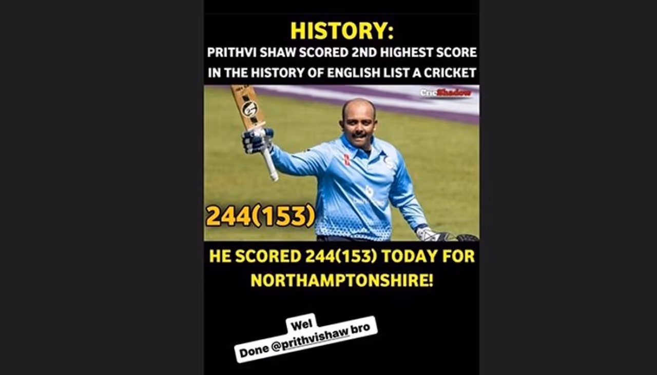 Prithvi Shaw's scintillating knock of 244 runs off 144 balls for Northamptonshire in England's One-Day Cup against Somerset has garnered widespread attention. The out-of-favour Indian cricketer's remarkable performance, which included 24 fours and eight sixes, not only set records but also led to a flurry of congratulatory messages from fans.