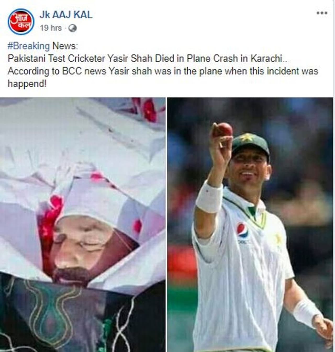 A Facebook post said, “#Breaking News: Pakistani Test Cricketer Yasir Shah Died in Plane Crash in Karachi..According to BCC news Yasir shah was in the plane when this incident was happend! (sic).” This post had 61 comments and 200 shares.