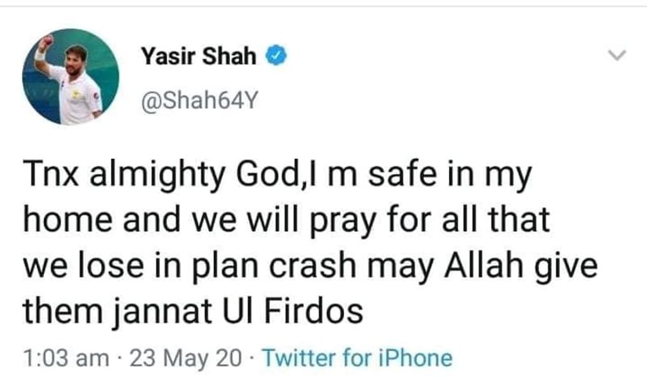 “Tnx almighty God, I m safe in my home, and we will pray for all those we lost in plane crash may Allah give them Jannat Ul Firdos,” the 34-year-old had tweeted.