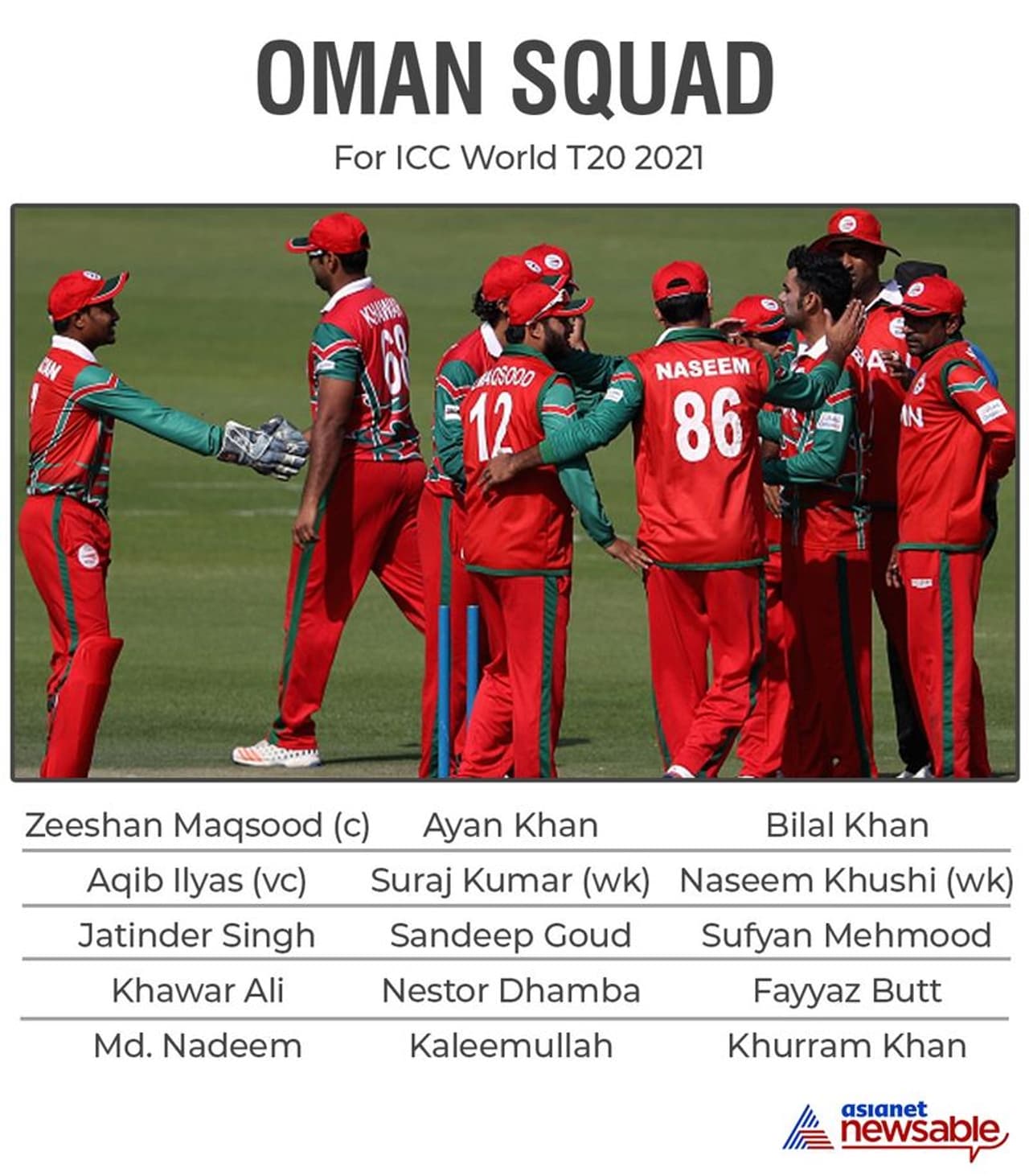 Oman squad: Zeeshan Maqsood (c), Aqib Ilyas (vc), Jatinder Singh, Khawar Ali, Mohammad Nadeem, Ayan Khan, Suraj Kumar (wk), Sandeep Goud, Nestor Dhamba, Kaleemullah, Bilal Khan, Naseem Khushi (wk), Sufyan Mehmood, Fayyaz Butt and Khurram Khan