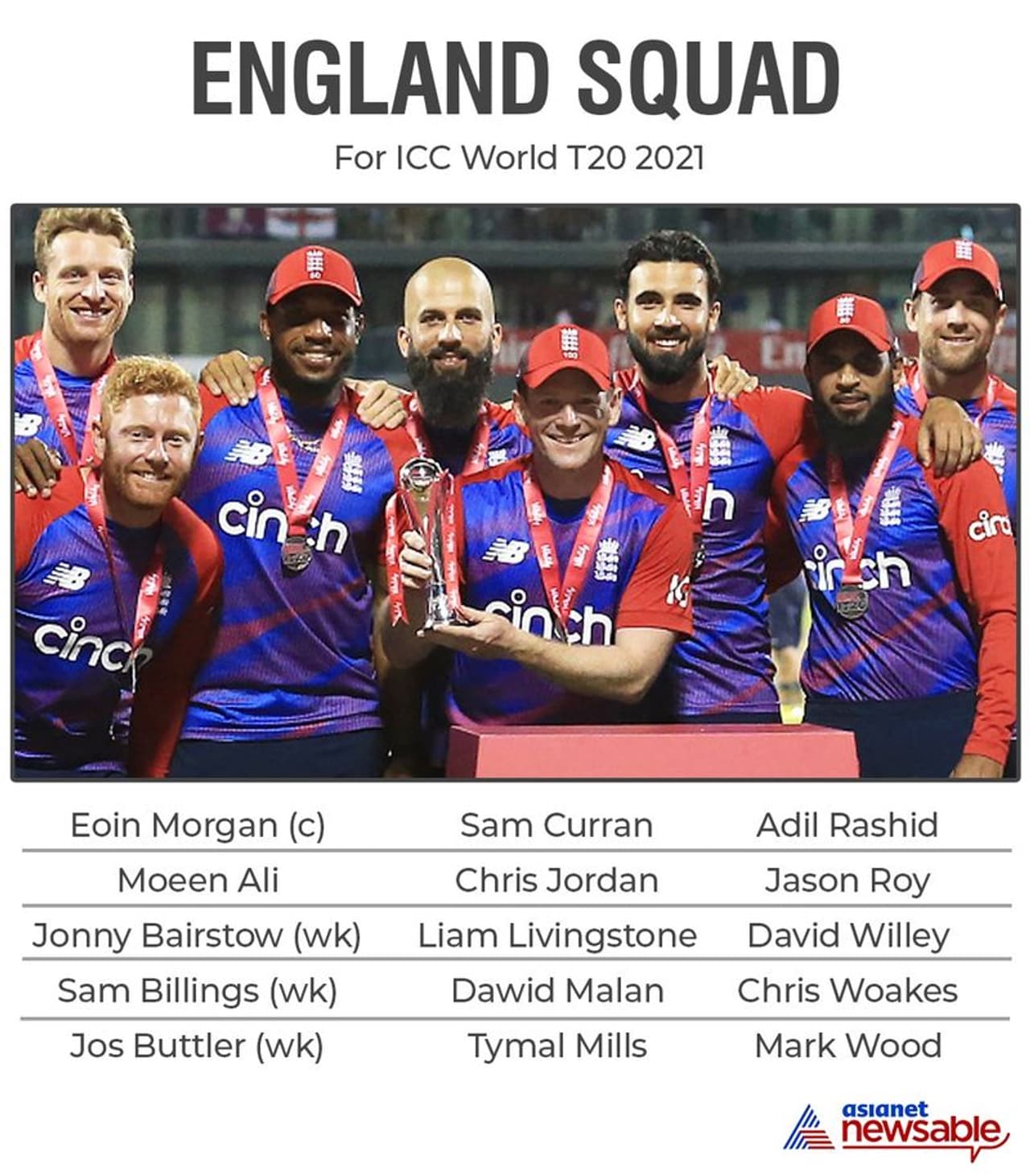 Squad: Eoin Morgan (c), Moeen Ali, Jonathan Bairstow (wk), Sam Billings (wk), Jos Buttler (wk), Sam Curran, Chris Jordan, Liam Livingstone, Dawid Malan, Tymal Mills, Adil Rashid, Jason Roy, David Willey, Chris Woakes and Mark Wood.