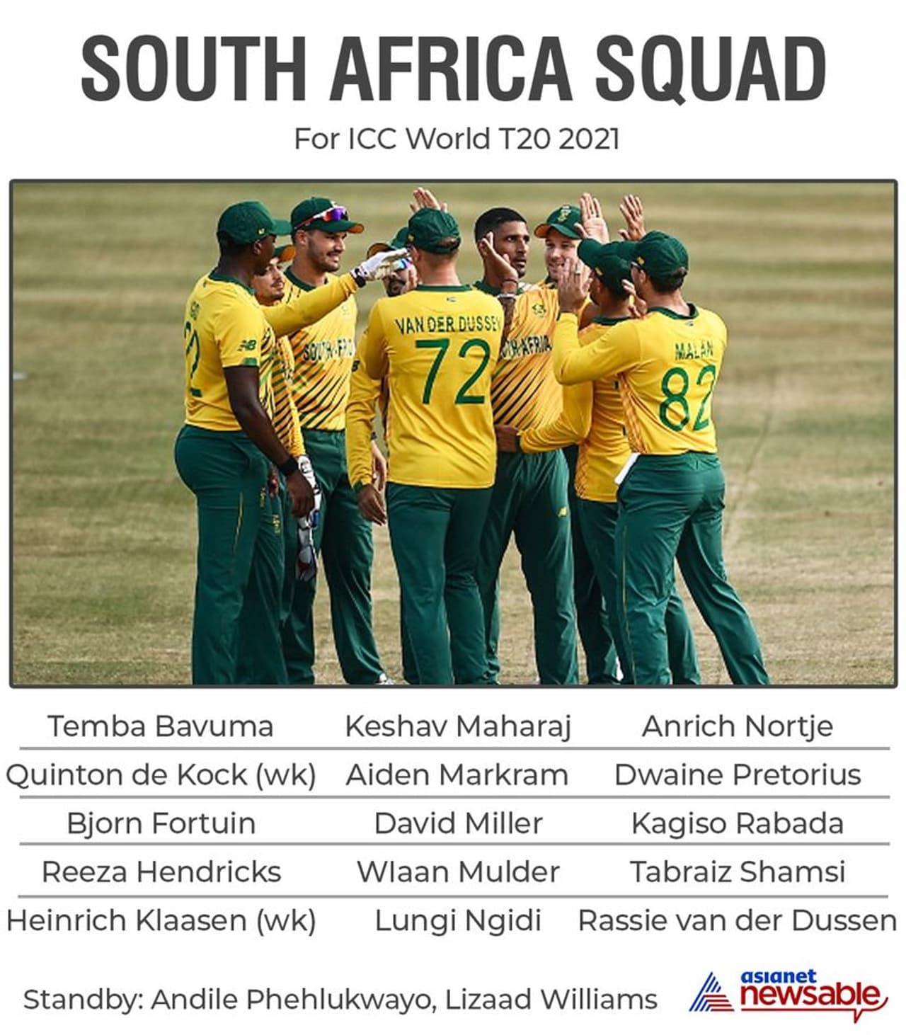 Squad: Temba Bavuma, Quinton de Kock (wk), Bjorn Fortuin, Reeza Hendricks, Heinrich Klaasen (wk), Keshav Maharaj, Aiden Markram, David Miller, WIaan Mulder, Lungi Ngidi, Anrich Nortje, Dwaine Pretorius, Kagiso Rabada, Tabraiz Shamsi, Rassie van der Dussen.