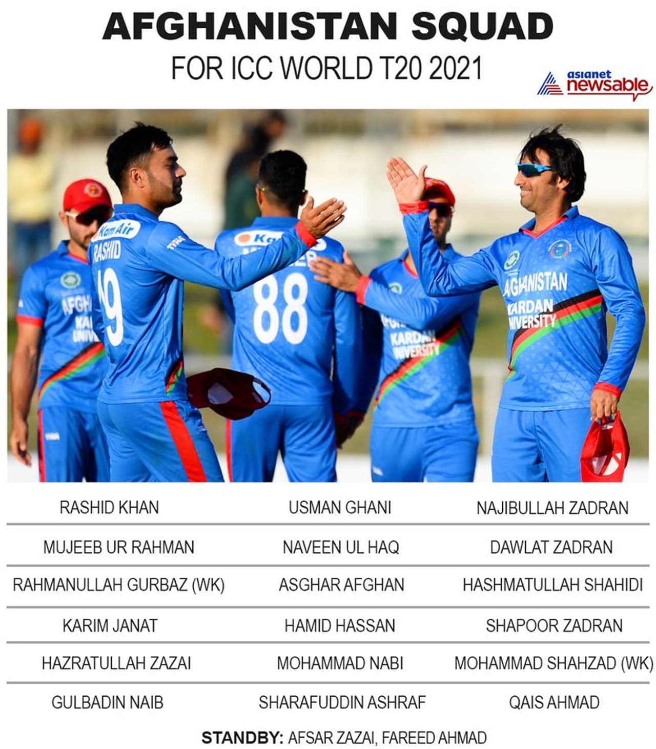 Squad: Rashid Khan, Mujeeb Ur Rahman, Rahmanullah Gurbaz (wk), Karim Janat, Hazratullah Zazai, Gulbadin Naib, Usman Ghani, Naveen ul Haq, Asghar Afghan, Hamid Hassan, Mohammad Nabi, Sharafuddin Ashraf, Najibullah Zadran, Dawlat Zadran, Hashmatullah Shahidi, Shapoor Zadran, Mohammad Shahzad (wk) and Qais Ahmad.