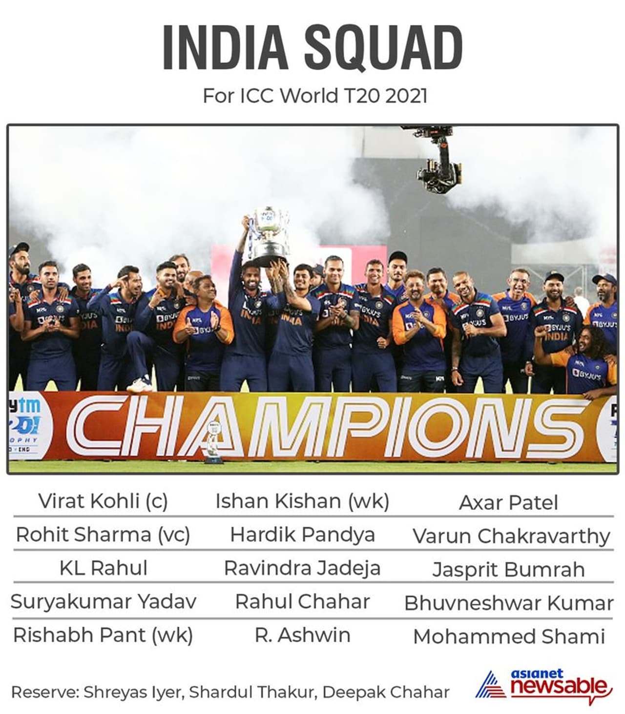 India squad for ICC World T20 2021: Virat Kohli (c), Rohit Sharma (vc), KL Rahul, Suryakumar Yadav, Rishabh Pant (wk), Ishan Kishan (wk), Hardik Pandya, Ravindra Jadeja, Rahul Chahar, Ravichandran Ashwin, Axar Patel, Varun Chakravarthy, Jasprit Bumrah, Bhuvneshwar Kumar and Mohammed Shami.