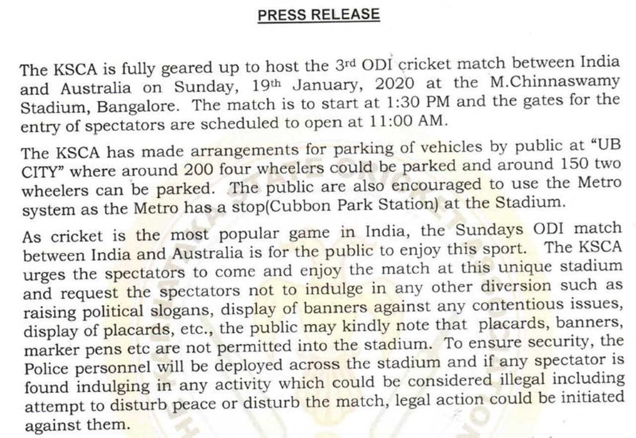 “The KSCA urges the spectators to come and enjoy the match at this unique stadium and requests the spectators not to indulge in any other diversion such as raising political slogans, display of banners against any contentious issues, display of placards, etc. The public may kindly note that placards, banners, marker pens etc are not permitted into the stadium,” Menon said in a press release.
