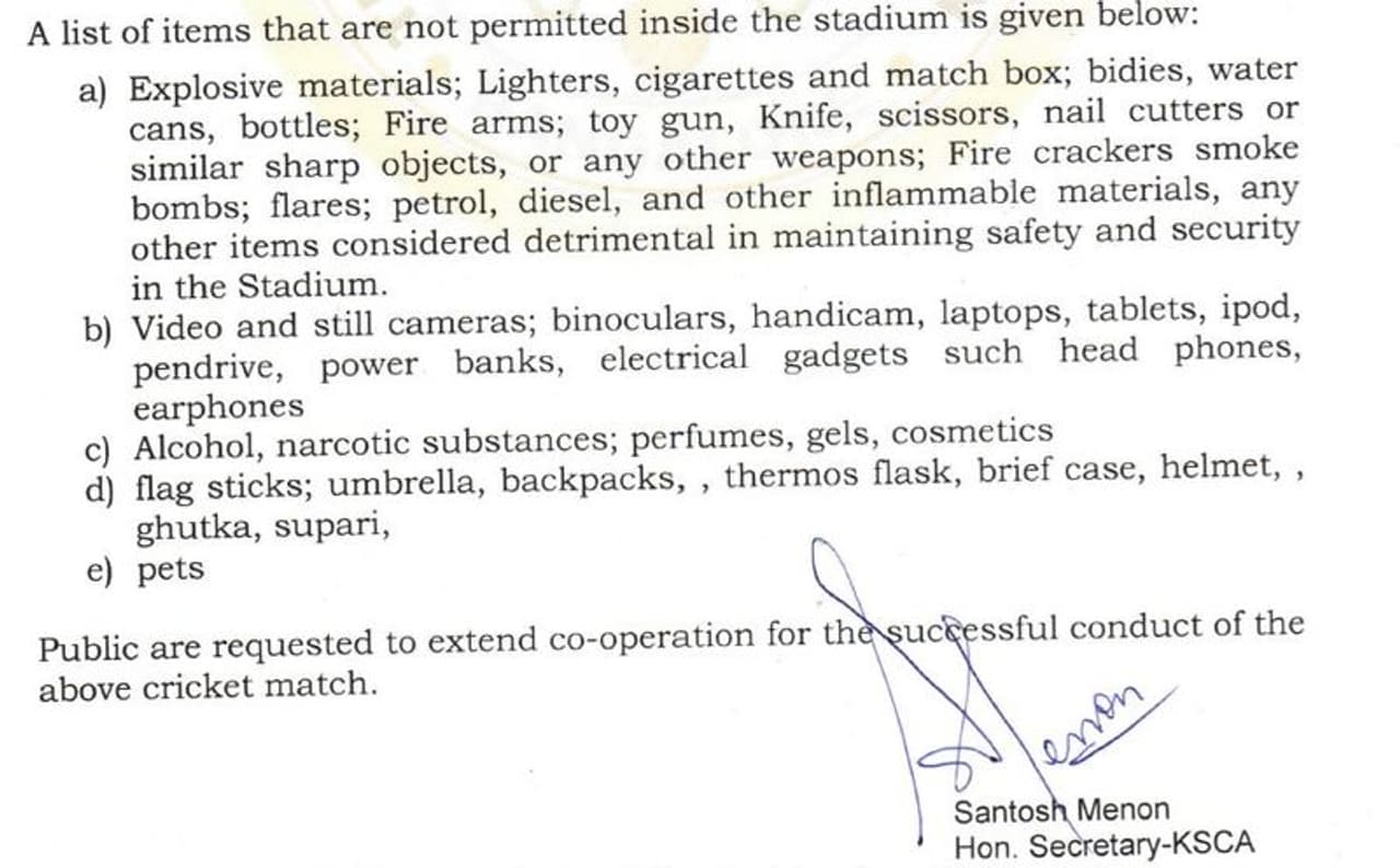 The KSCA listed out the list of items that are banned. It also stated that placards, banners and other things are not allowed into the stadium. The KSCA requested the public to extend co-operation for the successful conduct of the match.