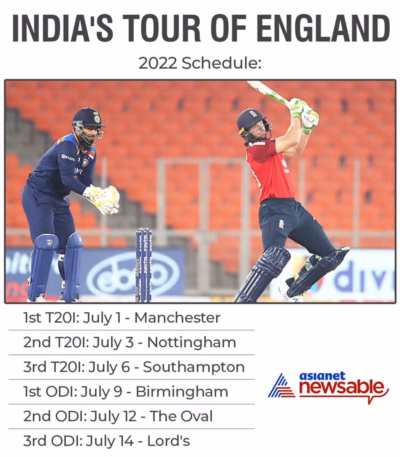 The tour begins with the T20Is and will be played on July 1, 3 and 6 in Manchester, Nottingham, and Southampton. It would conclude with the ODIs on July 9, 12 and 14 in Birmingham, The Oval and Lord's, respectively.