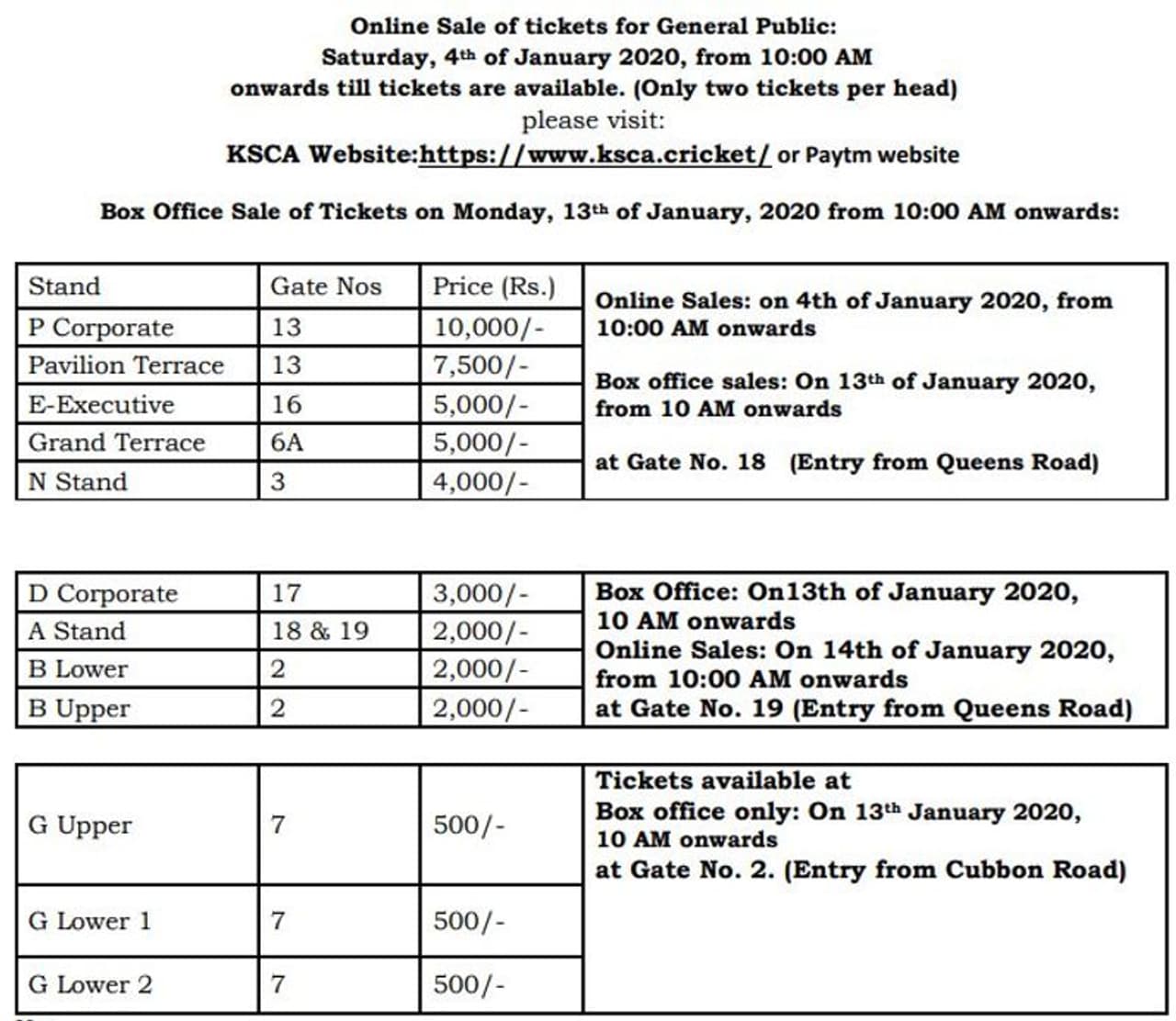 “Tickets of Rs 4,000 and above will be available only online. Any unsold tickets will be sold at the box office. Further information on the status of availability of tickets will be available on KSCA /Paytm website.”