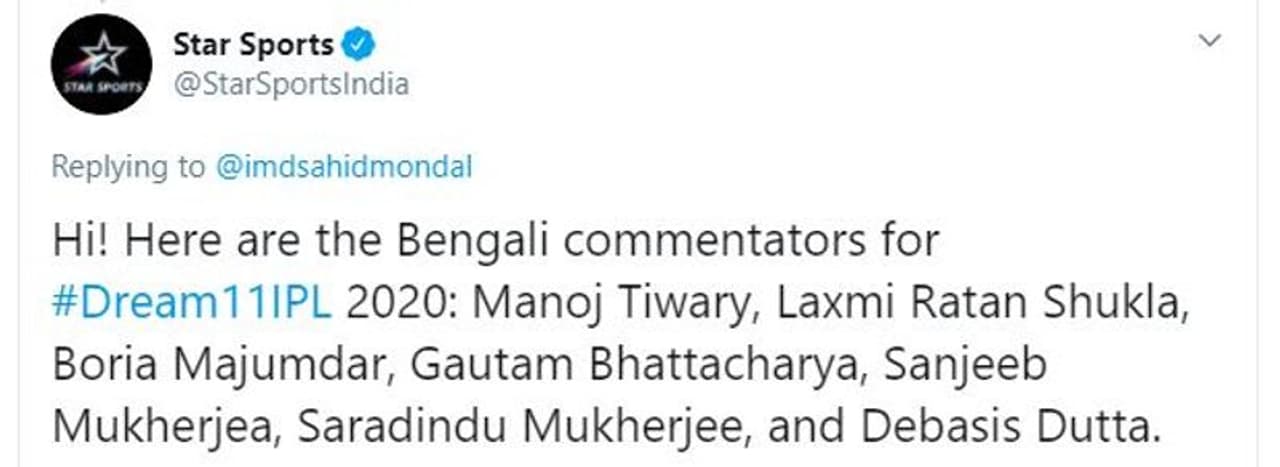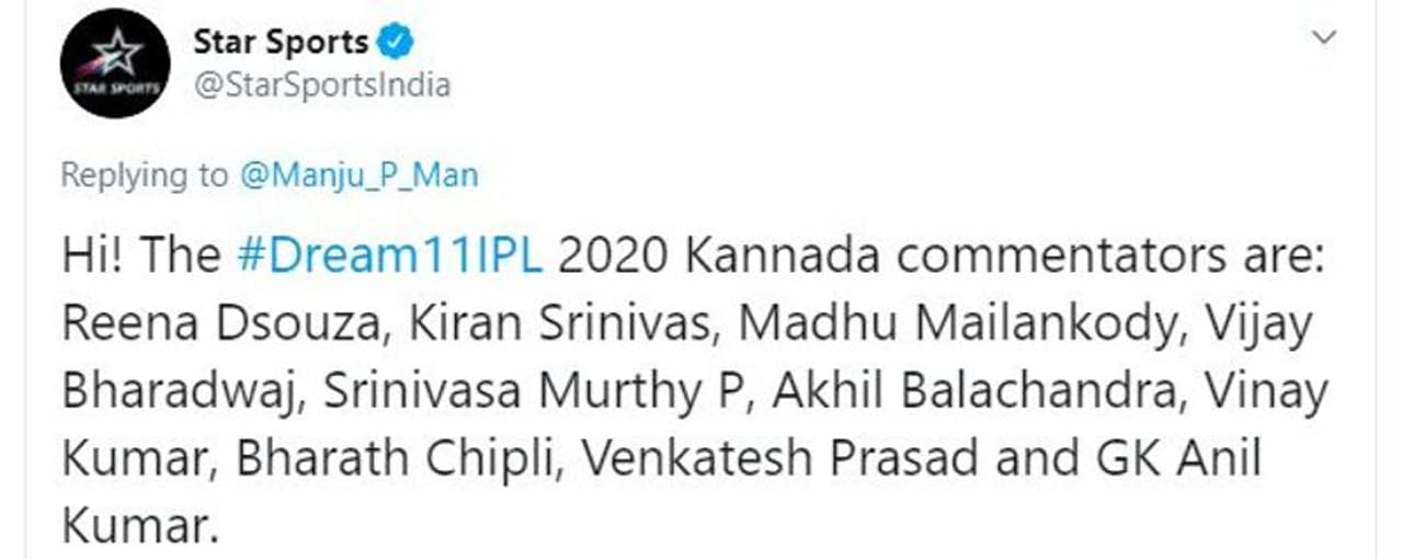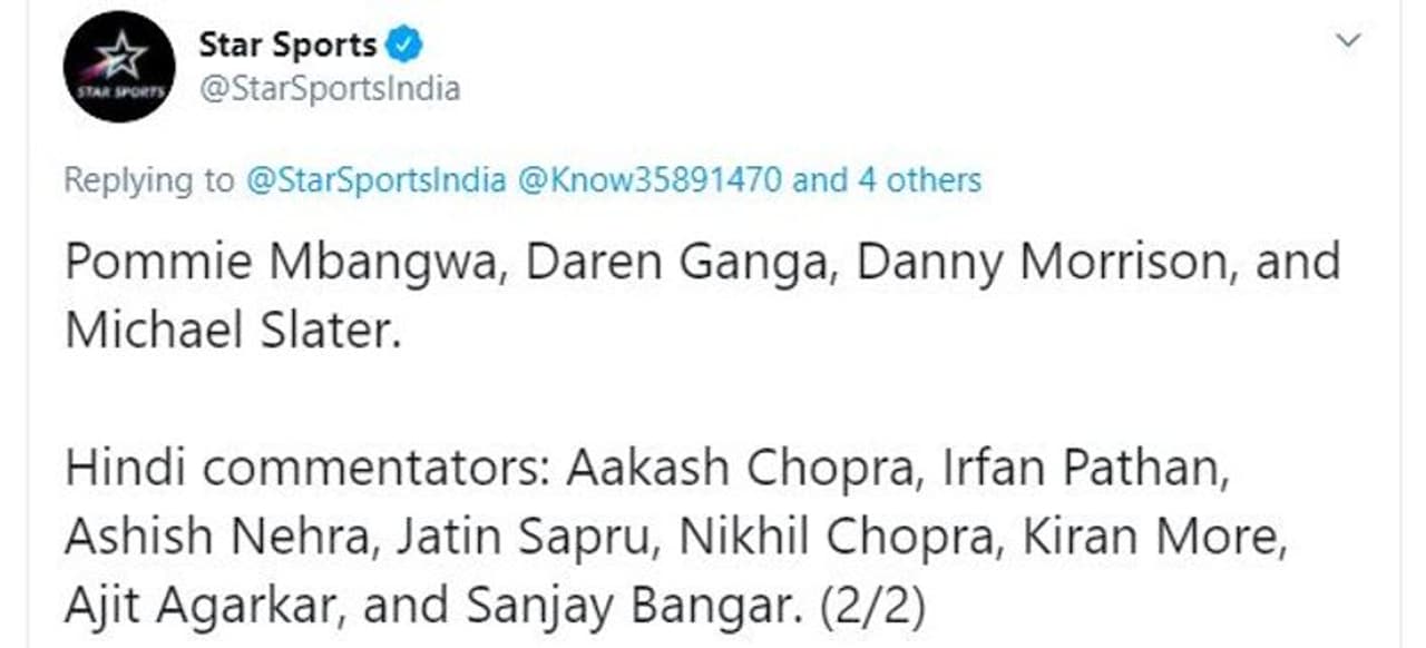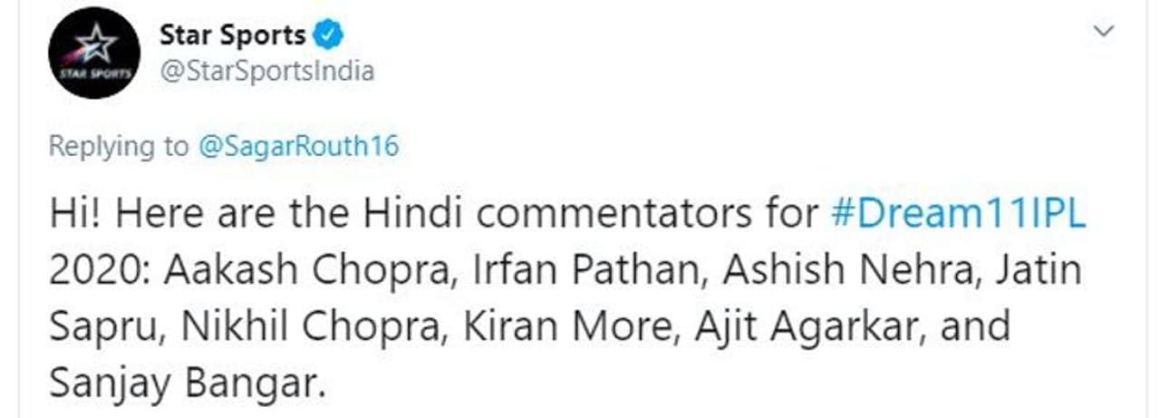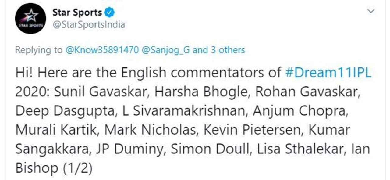 On its Twitter handle, Star Sports revealed the names of the commentators for IPL 2020. In response to questions from fans on Twitter, the host broadcaster listed out the names of those who will be doing commentary in English, Kannada, Bengali and Hindi.
