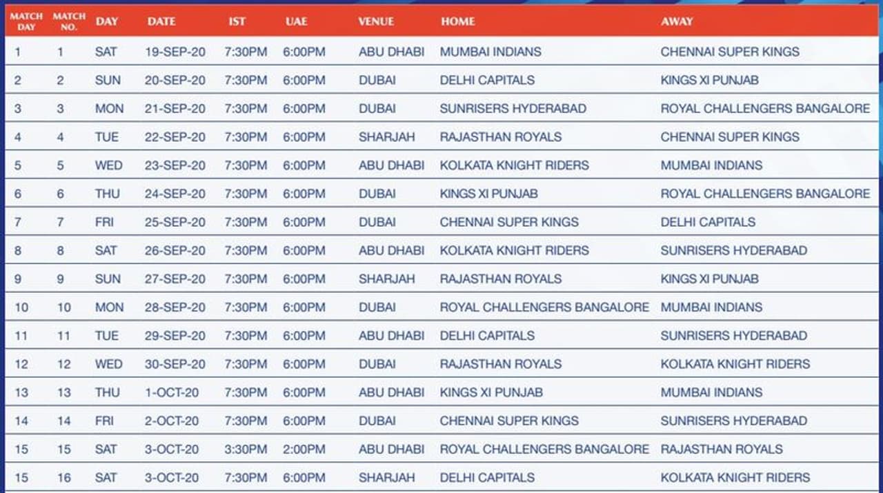 Here is the full schedule of IPL 2020. In the opening game, defending champions Mumbai Indians (MI) will face Chennai Super Kings (CSK) on September 19