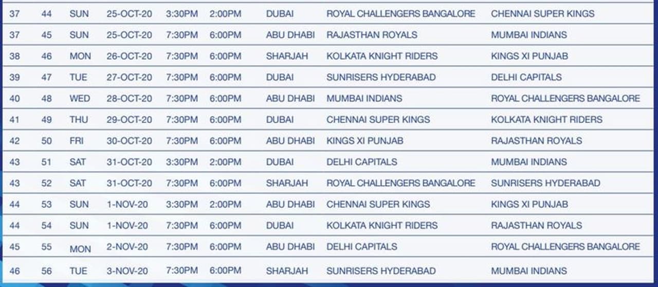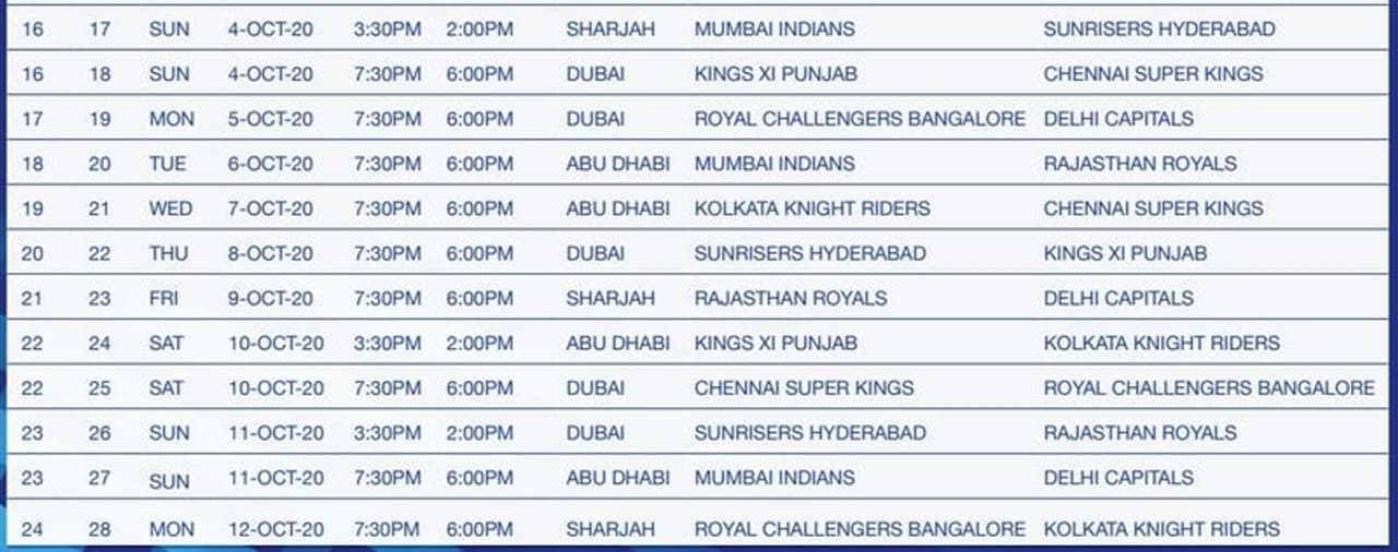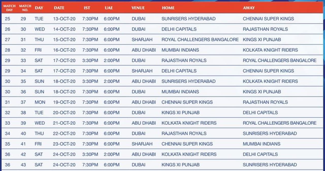 There will be 10 double headers with the first match starting at 3:30 PM IST (2:00 PM UAE time). All evening matches will start at 7:30 PM IST (6:00PM UAE time). In all, 24 matches will be held in Dubai, 20 in Abu Dhabi and 12 in Sharjah, the Board of Control for Cricket in India (BCCI) said in a media advisory.