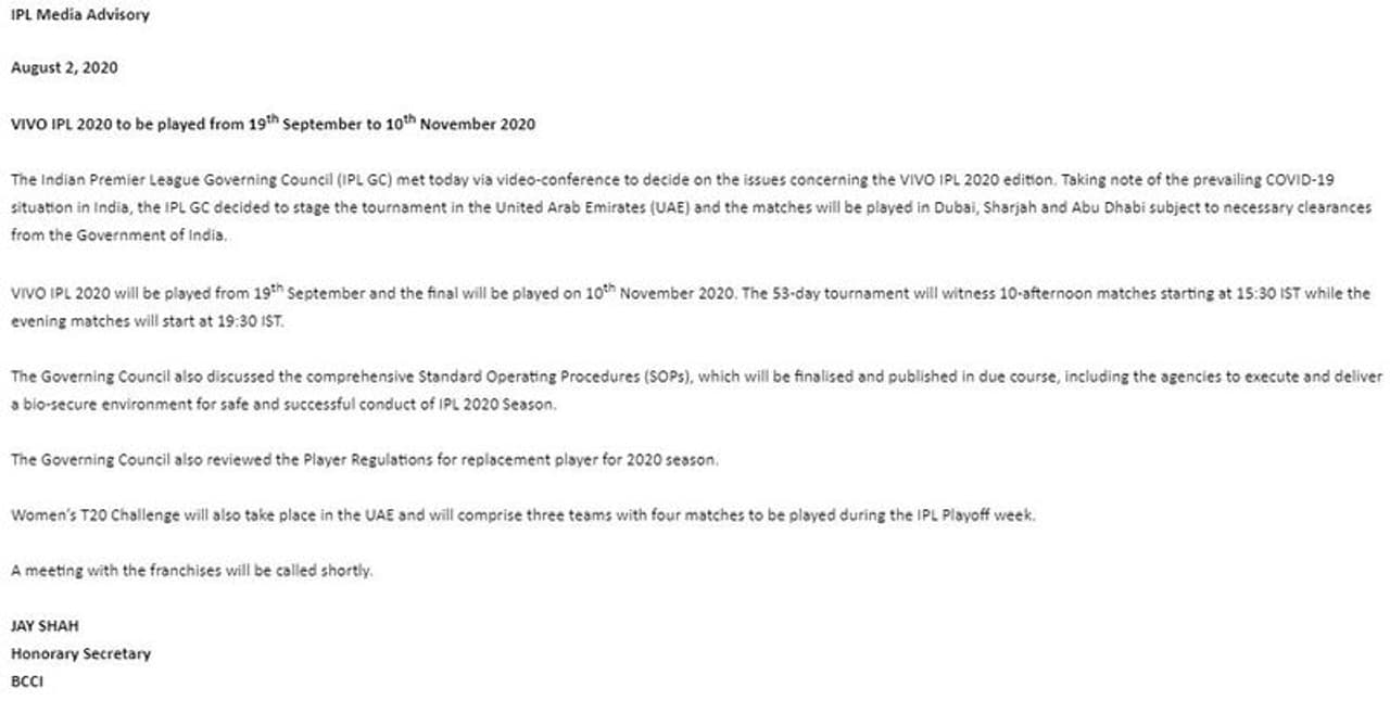“The Indian Premier League Governing Council (IPL GC) met today (August 2) via video-conference to decide on the issues concerning the VIVO IPL 2020 edition. Taking note of the prevailing COVID-19 situation in India, the IPL GC decided to stage the tournament in the United Arab Emirates (UAE) and the matches will be played in Dubai, Sharjah and Abu Dhabi subject to necessary clearances from the Government of India,” BCCI secretary Jay Shah said in a media advisory.