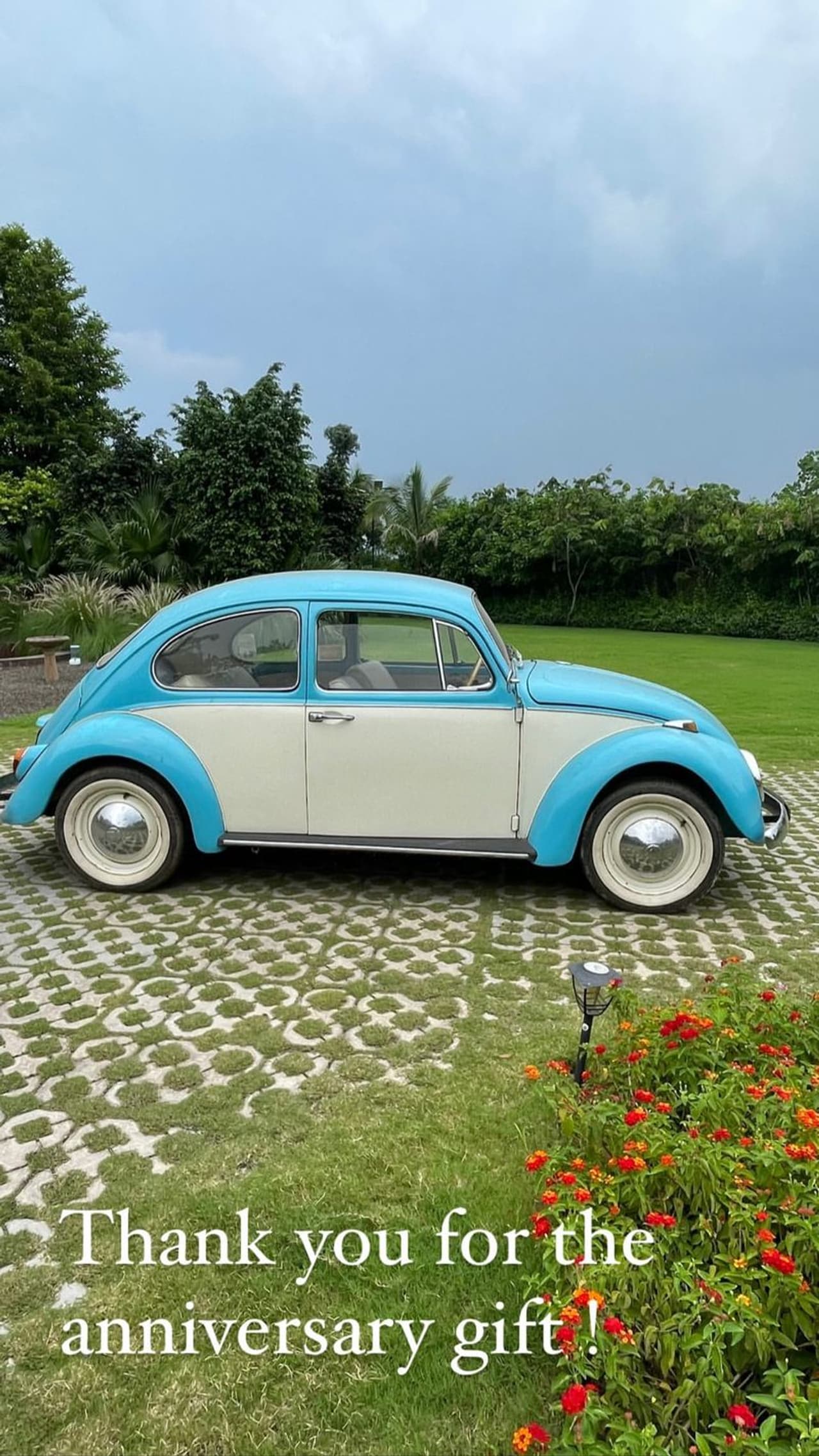 Sakshi shared a picture of the gift through an Instagram story that was truly special in the form of a vintage car, with a mixed colour of sky blue and off-white. She captioned the post, "Thank you for the anniversary gift!"