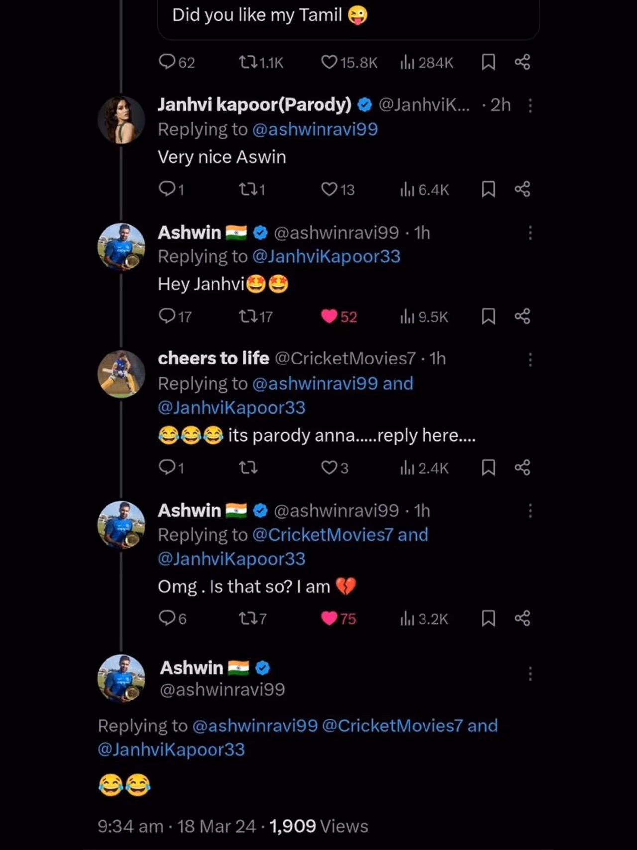 "Very nice Ashwin," a verified account named Janhvi Kapoor (Parody) replied on Ashwin's tweet. The 37-year-old then replied with "Hey Janhvi" along with a couple of heart-eye emojis.